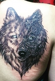女生背部黑色素描点刺技巧创意花纹狼头纹身图片