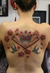 女生背部好看的彩色蝴蝶燕子与扇子花朵纹身图案