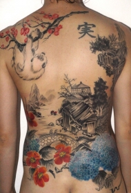 满背美丽的彩色房子与树枝花朵猴子纹身图案