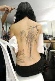女生背部亚洲风格水墨山水画纹身图案