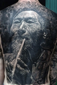 满背惊人的非常逼真黑白亚洲男子肖像纹身图案