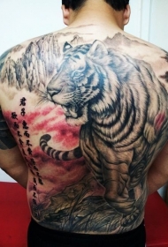 背部亚洲风格的白虎汉字山脉纹身图案