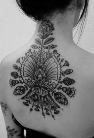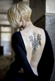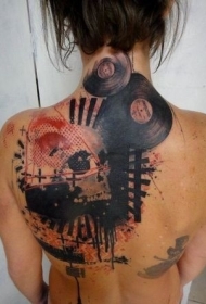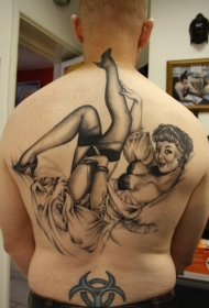 背部怪异的女性肖像和乌鸦字母纹身图案