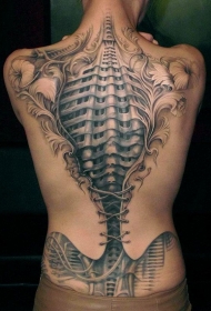 背部解剖骨架花朵黑灰撕皮纹身图案