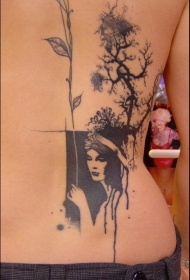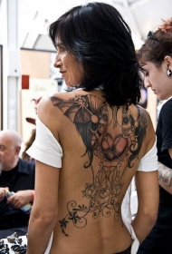 女孩满背蝴蝶和花朵黑灰纹身图案