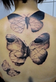 背部点刺风格黑色的蝴蝶和眼睛纹身图案