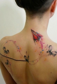 女生背部可爱的彩色纸飞机与蝴蝶纹身图案