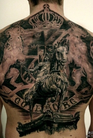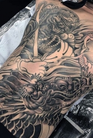 背部日式风格的龙与玫瑰和扑克牌纹身图案