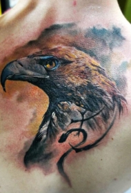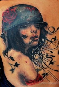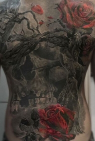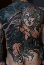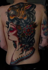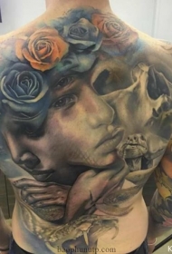 背部新传统风格彩色女人脸与骷髅和玫瑰纹身图案