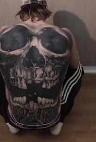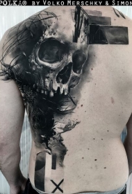 背部黑灰风格的人类骷髅几何饰品纹身图案