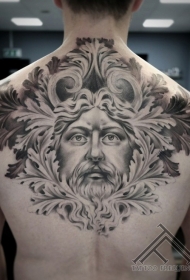 黑灰风格背部耶稣肖像藤蔓纹身图案