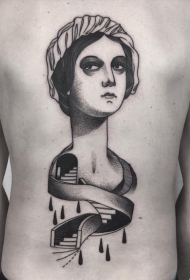 背部超现实主义风格黑色点刺女人楼梯纹身图案