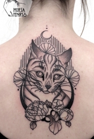 背部简单的黑色线条甜蜜猫咪纹身图案