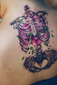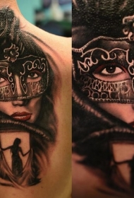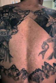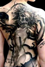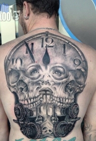背部黑灰风格的时钟与骷髅和女性纹身图案