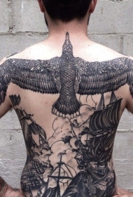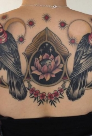背部点刺风格黑色的天秤座与太阳和月亮纹身图案