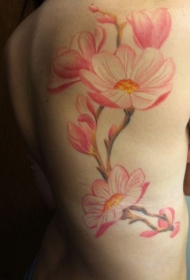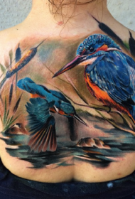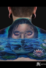 背部新风格彩色游泳女性与骷髅莲花纹身图案
