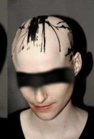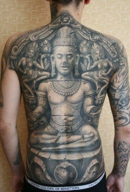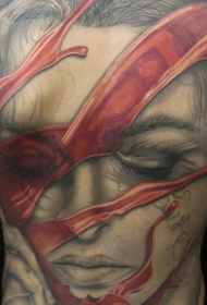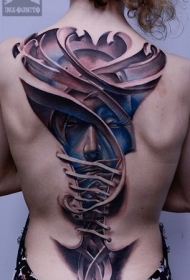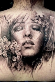 背部写实风格黑灰女性脸与翅膀花朵纹身图案