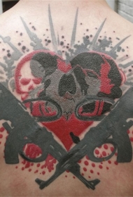 背部红色心形和AK步枪鸟类骷髅纹身图案