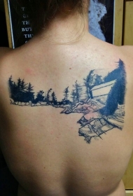 写实风格栩栩如生的咆哮狮子和大树背部纹身图案