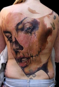 背部令人毛骨悚然的写实哭泣女人脸纹身图案