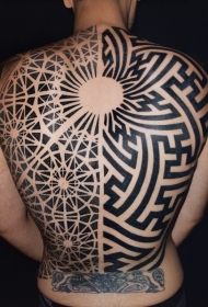 背部彩色的大鸟与寺庙和太阳纹身图案