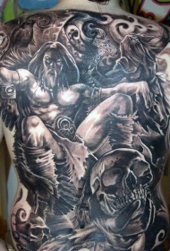 背部大型黑灰风格的幻想战士与骷髅纹身图案
