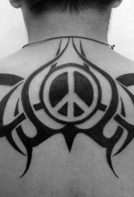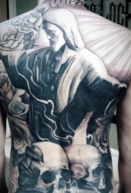 背部石雕风格的雕像与骷髅玫瑰纹身图案