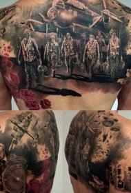 背部写实风格的彩色二战飞行员和飞机纹身图案