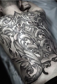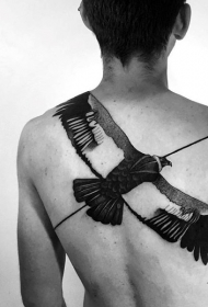 奇妙的黑白线条小鸟与植物几何背部纹身图案