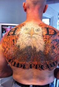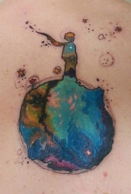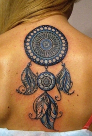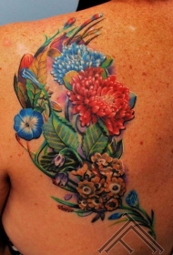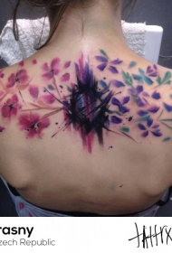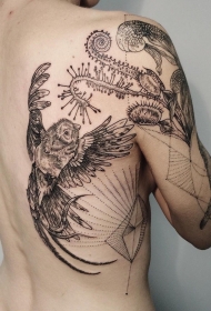 背部插画风格彩色的猫头鹰与花蕊纹身图案