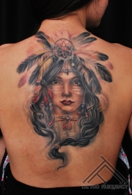 背部插画风格彩色印度女人肖像纹身图案