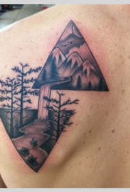 背部黑灰风格几何与山林瀑布纹身图案