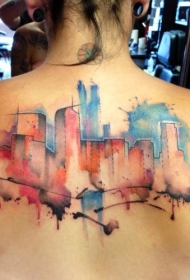背部城市建筑水彩画风格泼墨纹身图案