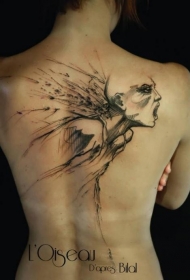 素描风格黑色的可怕女人背部纹身图案