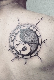 背部点刺风格阴阳八卦符号时钟纹身图案