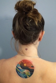 背部彩色的阴阳八卦符号与海面日出纹身图案