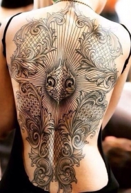 背部华丽的黑灰鹰纹身图案