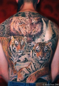 背部惊人的写实风格彩色大老虎家族纹身图案