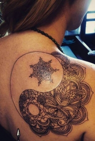 背部黑色的阴阳八卦符号组合梵花纹身图案