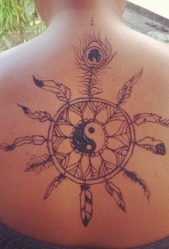 背部黑色的阴阳八卦风格的捕梦网纹身图案