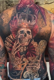 背部令人毛骨悚然的彩色骷髅女王纹身图案