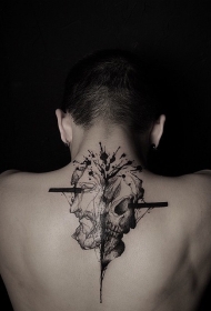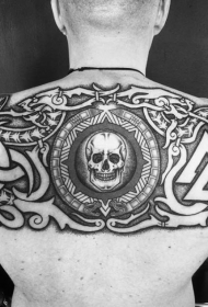 背部黑色人类骷髅与各种符号纹身图案