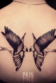 背部黑色逼真的两只飞鸟纹身图案