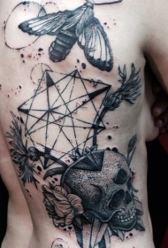 黑色点刺风格骷髅几何蝴蝶背部纹身图案