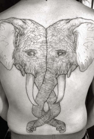 背部黑灰线条组合的精致大象头纹身图案