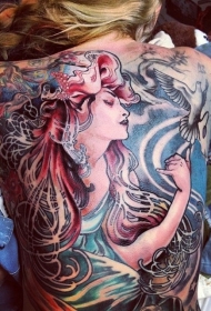 背部好看的彩色女性与鸽子纹身图案