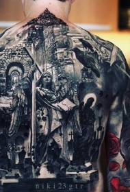 背部和肩部深色的十字架与手和鸽子纹身图案