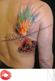 背部日本风格大型五彩孔雀和花朵纹身图案
