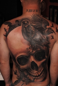 背部黑灰风格骷髅与乌鸦字母纹身图案