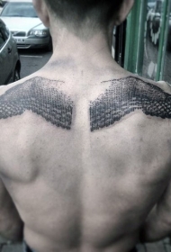 背部独特的黑色雕刻风格点刺翅膀纹身图案